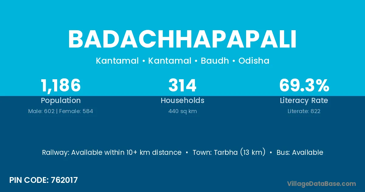 Badachhapapali village has a total population of 1,186 people, of which 602 are males and 584 are females.