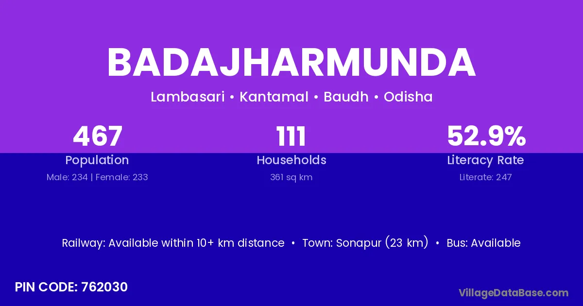 Sonapur (23 km) is the nearest town to Badajharmunda village for major economic activities and is located approximately 23 km away.