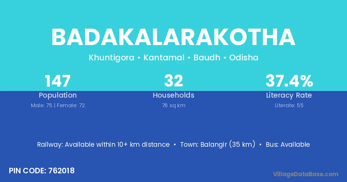 Balangir (35 km) is the nearest town to Badakalarakotha village for major economic activities and is located approximately 35 km away.