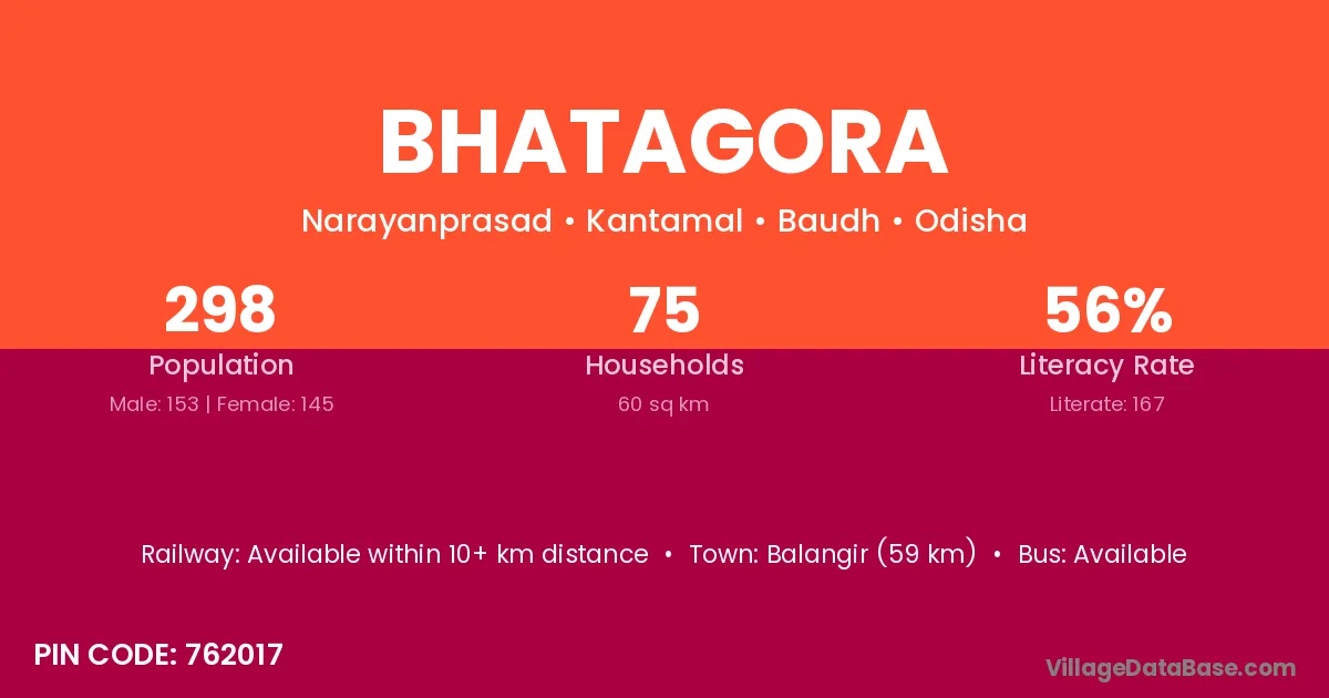 Balangir (59 km) is the nearest town to Bhatagora village for major economic activities and is located approximately 59 km away.