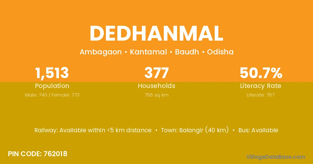 Balangir (40 km) is the nearest town to Dedhanmal village for major economic activities and is located approximately 40 km away.