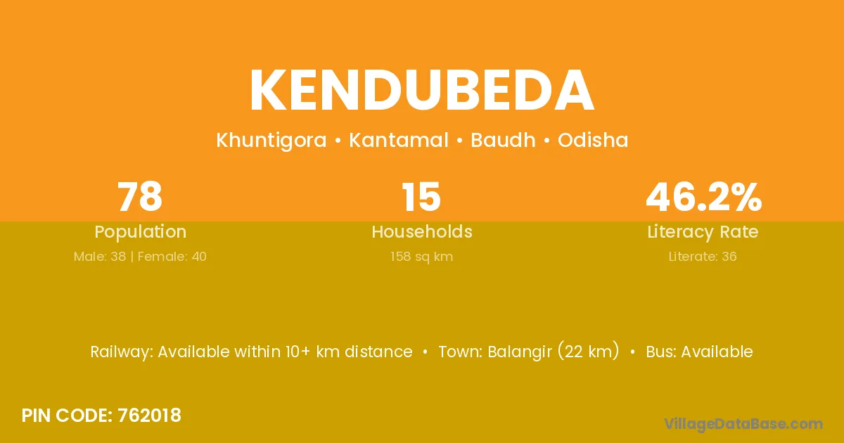 Balangir (22 km) is the nearest town to Kendubeda village for major economic activities and is located approximately 22 km away.