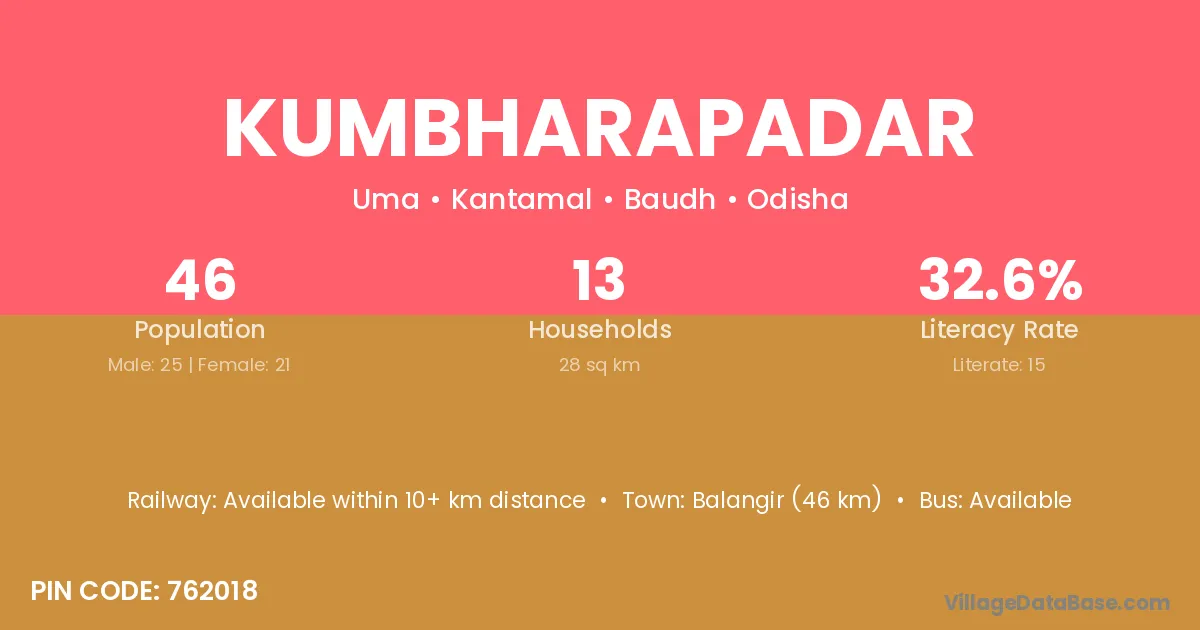 Balangir (46 km) is the nearest town to Kumbharapadar village for major economic activities and is located approximately 46 km away.