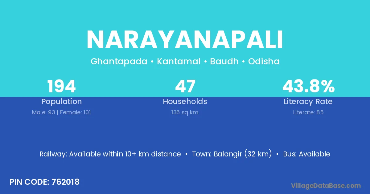 Narayanapali village has a total population of 194 people, of which 93 are males and 101 are females.