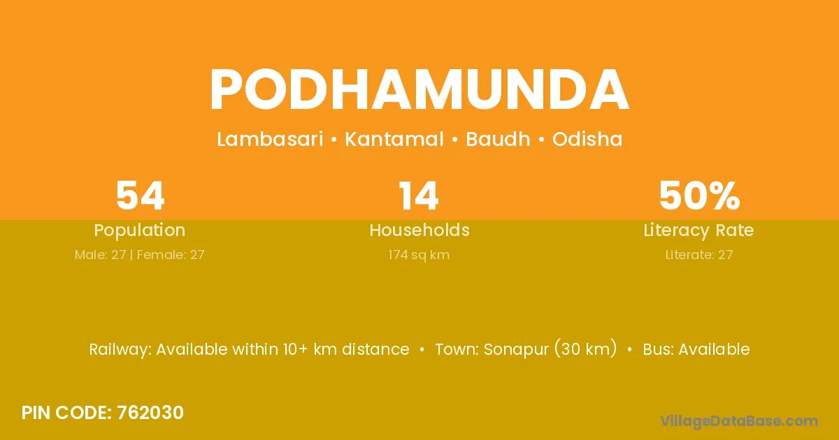 Sonapur (30 km) is the nearest town to Podhamunda village for major economic activities and is located approximately 30 km away.