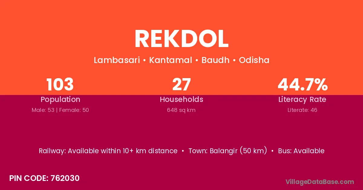 Balangir (50 km) is the nearest town to Rekdol village for major economic activities and is located approximately 50 km away.