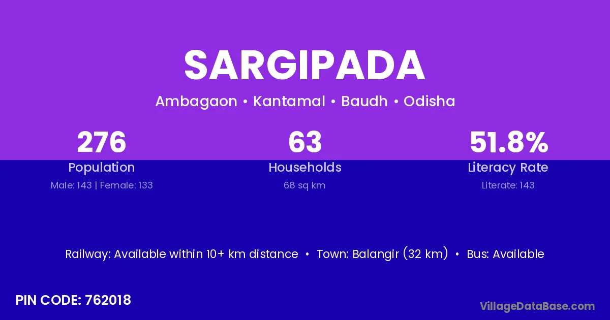 Balangir (32 km) is the nearest town to Sargipada village for major economic activities and is located approximately 32 km away.