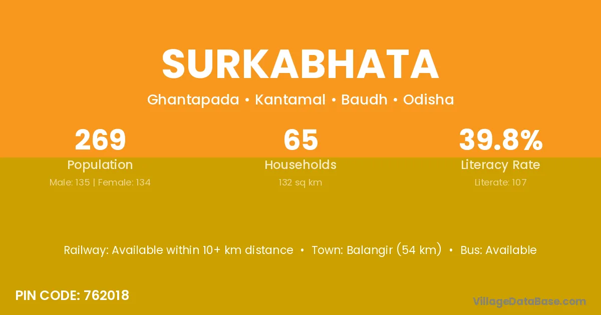 Surkabhata village has a total population of 269 people, of which 135 are males and 134 are females.
