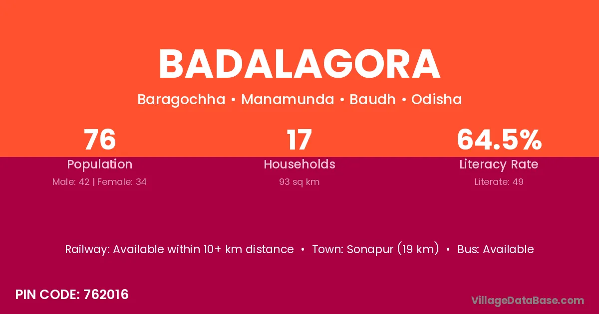 Badalagora village has a total population of 76 people, of which 42 are males and 34 are females.