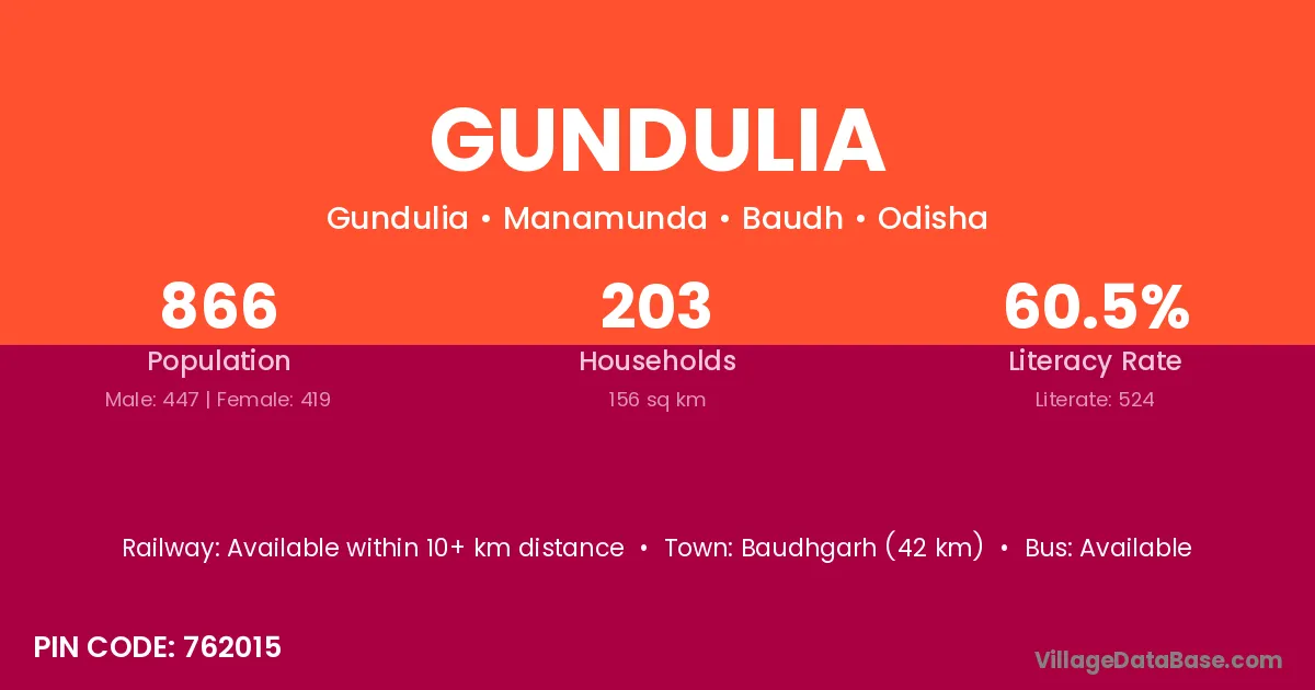 Gundulia village has a total population of 866 people, of which 447 are males and 419 are females.