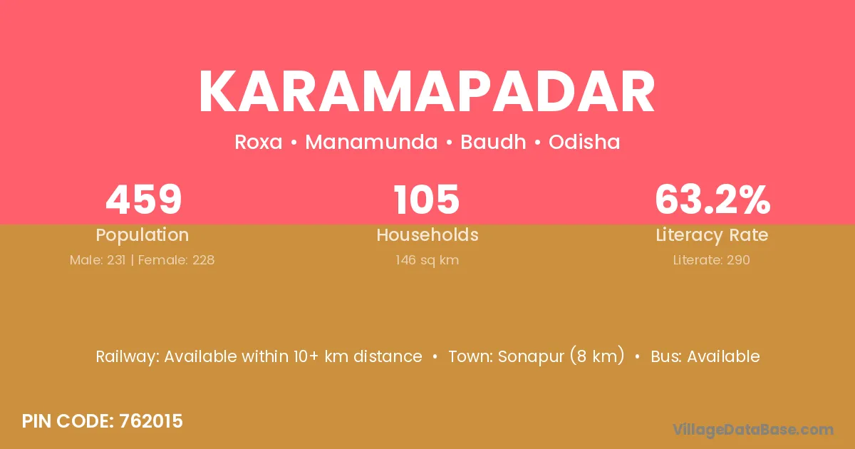 Karamapadar village has a total population of 459 people, of which 231 are males and 228 are females.