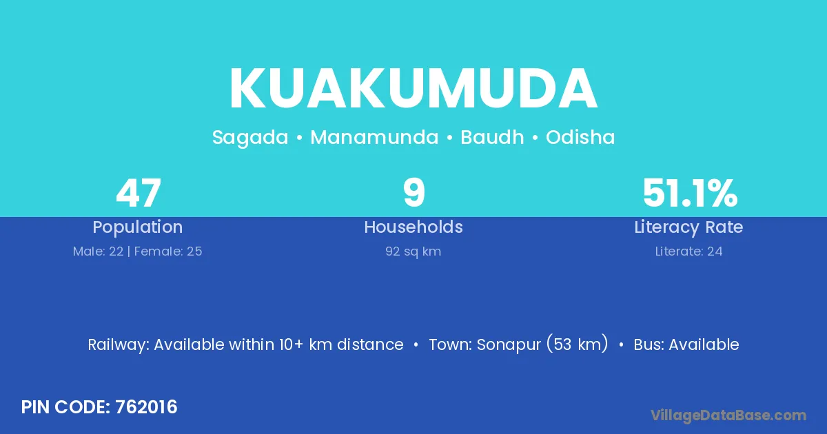 Kuakumuda village has a total population of 47 people, of which 22 are males and 25 are females.