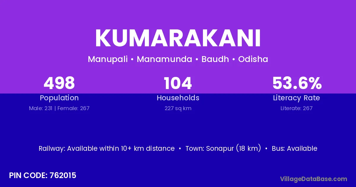 Kumarakani village has a total population of 498 people, of which 231 are males and 267 are females.