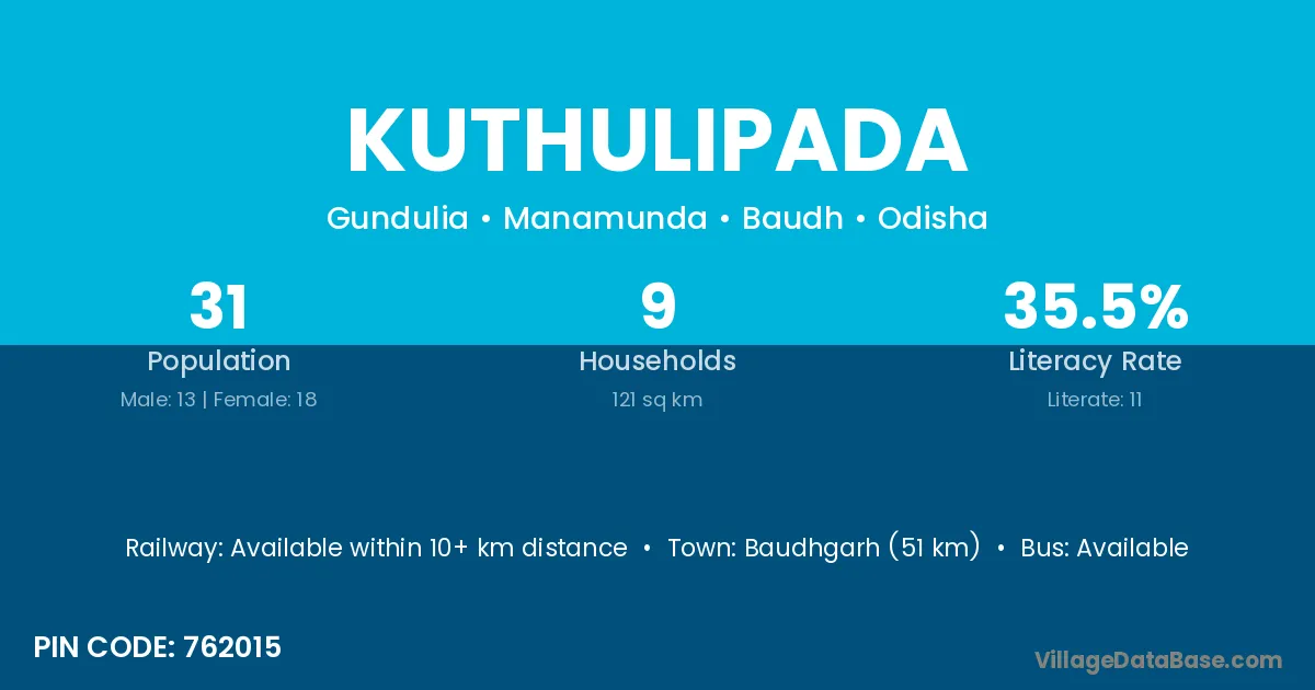 Baudhgarh (51 km) is the nearest town to Kuthulipada village for major economic activities and is located approximately 51 km away.