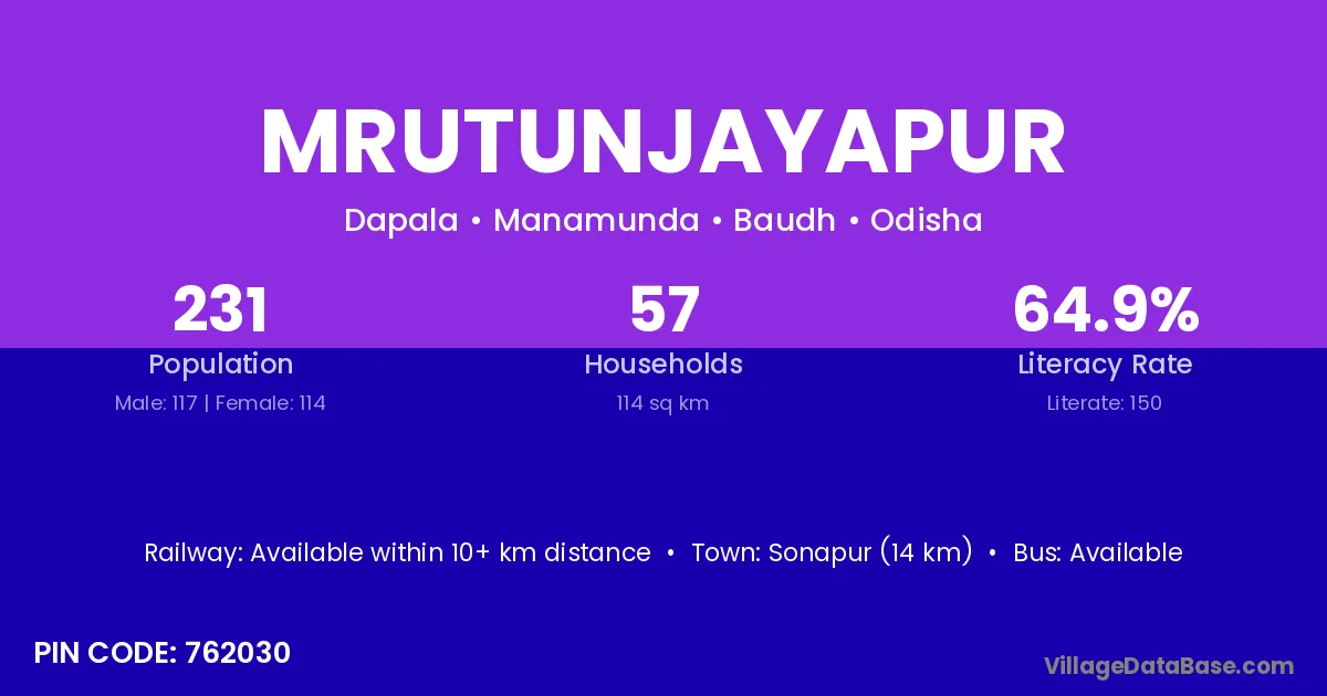 Mrutunjayapur village has a total population of 231 people, of which 117 are males and 114 are females.