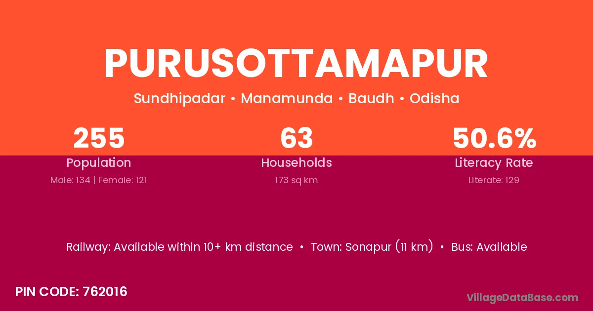 According to Census 2011 information, the village code of Purusottamapur village is 762016.