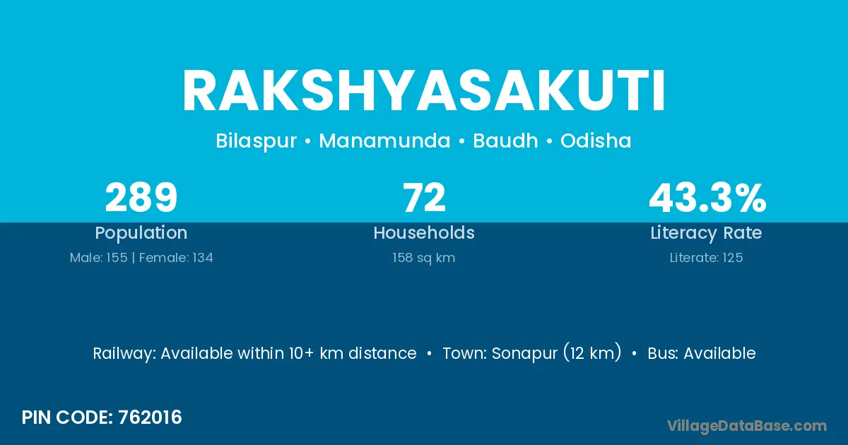 Rakshyasakuti village has a total population of 289 people, of which 155 are males and 134 are females.