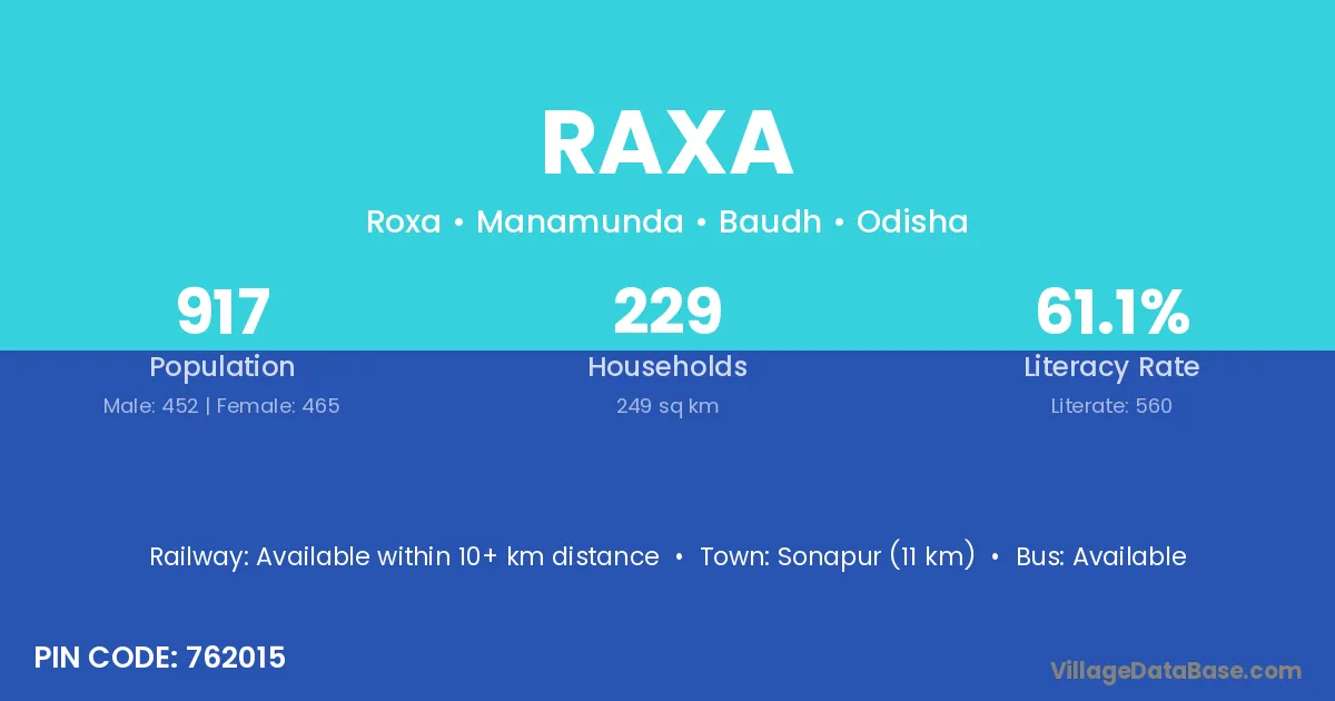 Raxa village has a total population of 917 people, of which 452 are males and 465 are females.