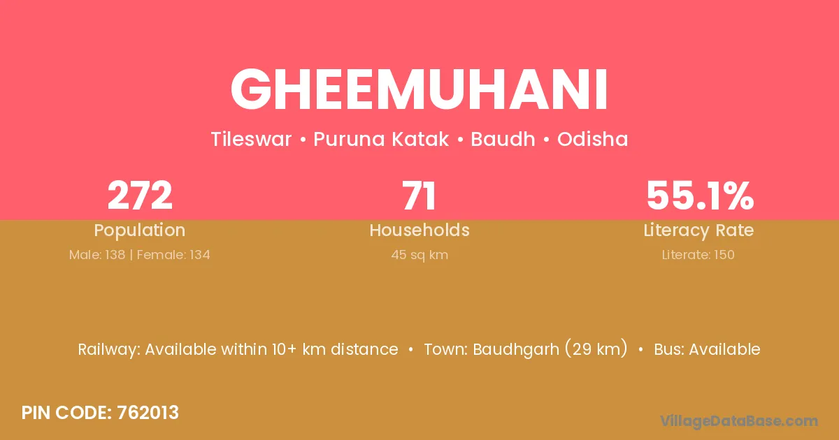 Baudhgarh (29 km) is the nearest town to Gheemuhani village for major economic activities and is located approximately 29 km away.