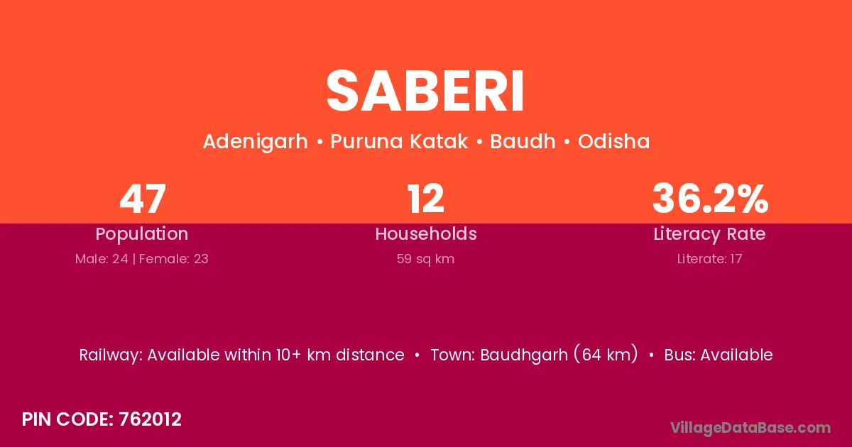 Saberi village has a total population of 47 people, of which 24 are males and 23 are females.