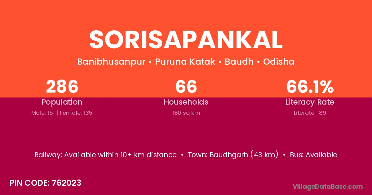 Baudhgarh (43 km) is the nearest town to Sorisapankal village for major economic activities and is located approximately 43 km away.