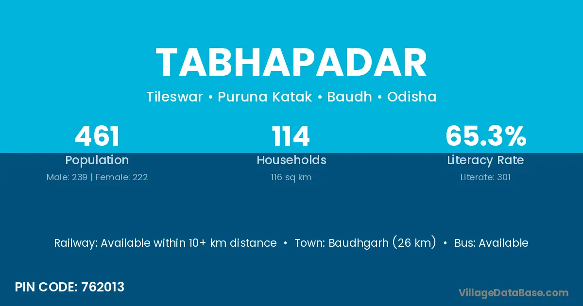 Tabhapadar village has a total population of 461 people, of which 239 are males and 222 are females.