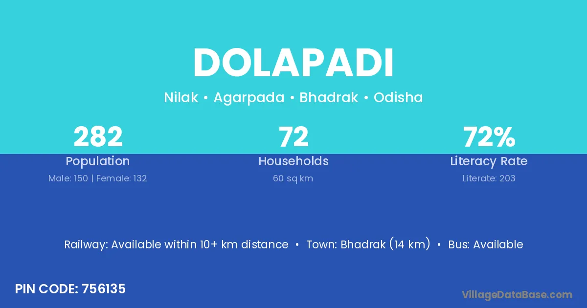 Bhadrak (14 km) is the nearest town to Dolapadi village for major economic activities and is located approximately 14 km away.