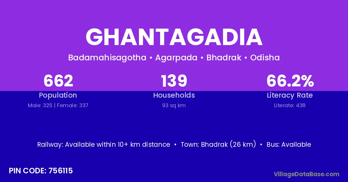 Bhadrak (26 km) is the nearest town to Ghantagadia village for major economic activities and is located approximately 26 km away.