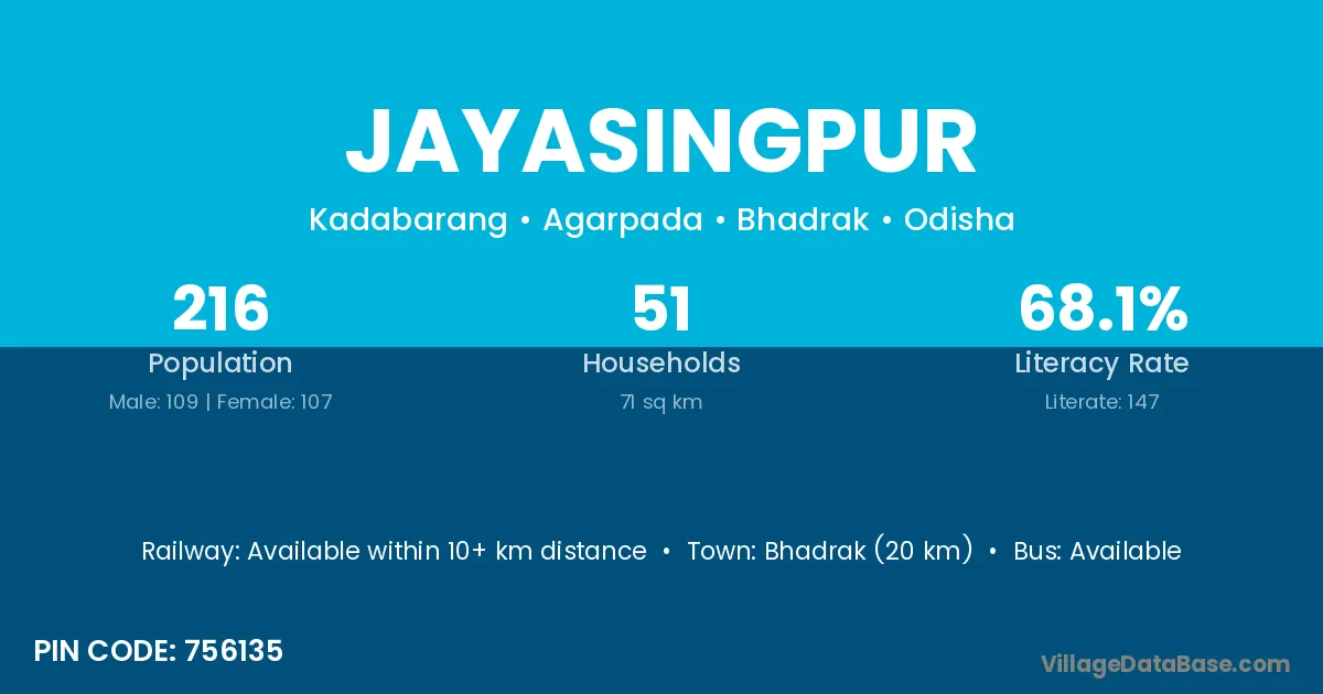 Bhadrak (20 km) is the nearest town to Jayasingpur village for major economic activities and is located approximately 20 km away.