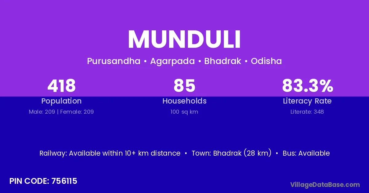 Bhadrak (28 km) is the nearest town to Munduli village for major economic activities and is located approximately 28 km away.