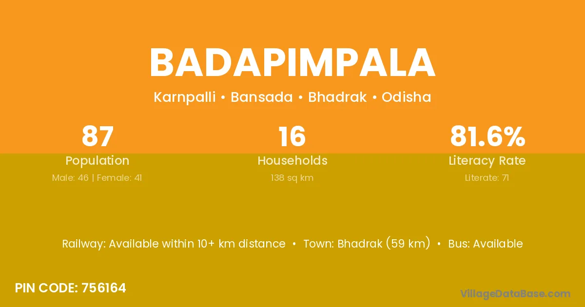 Bhadrak (59 km) is the nearest town to Badapimpala village for major economic activities and is located approximately 59 km away.