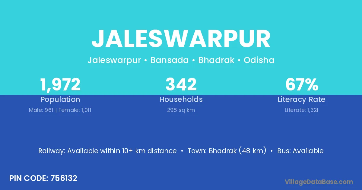 Bhadrak (48 km) is the nearest town to Jaleswarpur village for major economic activities and is located approximately 48 km away.