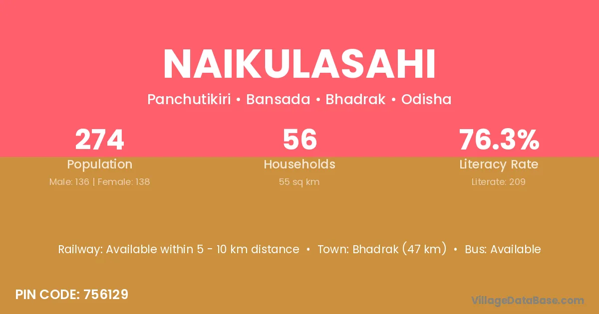 Bhadrak (47 km) is the nearest town to Naikulasahi village for major economic activities and is located approximately 47 km away.