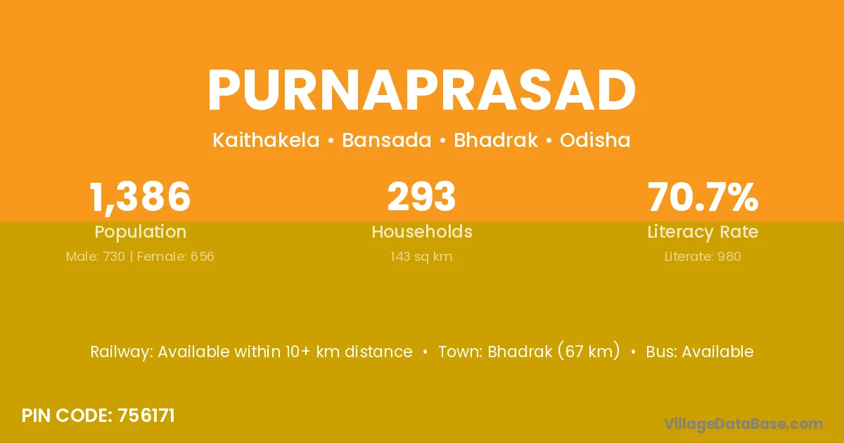 Bhadrak (67 km) is the nearest town to Purnaprasad village for major economic activities and is located approximately 67 km away.