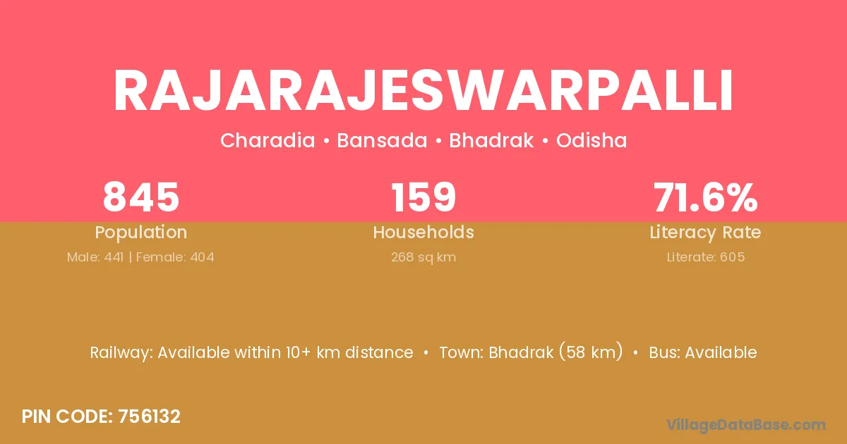 Bhadrak (58 km) is the nearest town to Rajarajeswarpalli village for major economic activities and is located approximately 58 km away.