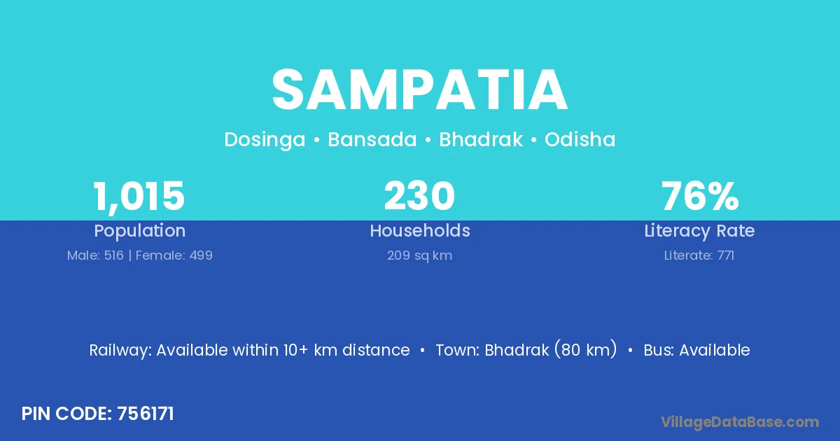 Bhadrak (80 km) is the nearest town to Sampatia village for major economic activities and is located approximately 80 km away.