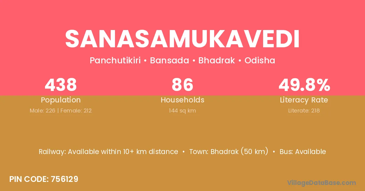 Sanasamukavedi village has a total population of 438 people, of which 226 are males and 212 are females.