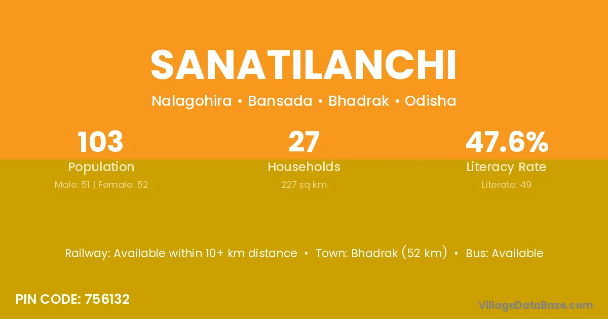 Bhadrak (52 km) is the nearest town to Sanatilanchi village for major economic activities and is located approximately 52 km away.