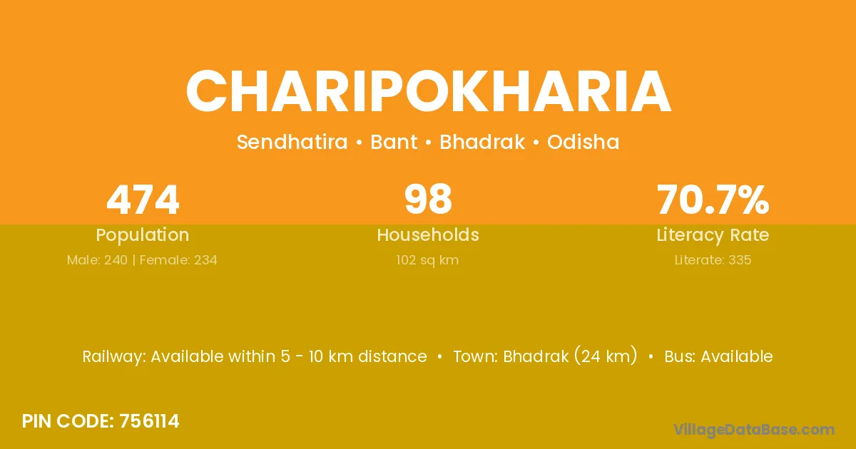 Bhadrak (24 km) is the nearest town to Charipokharia village for major economic activities and is located approximately 24 km away.