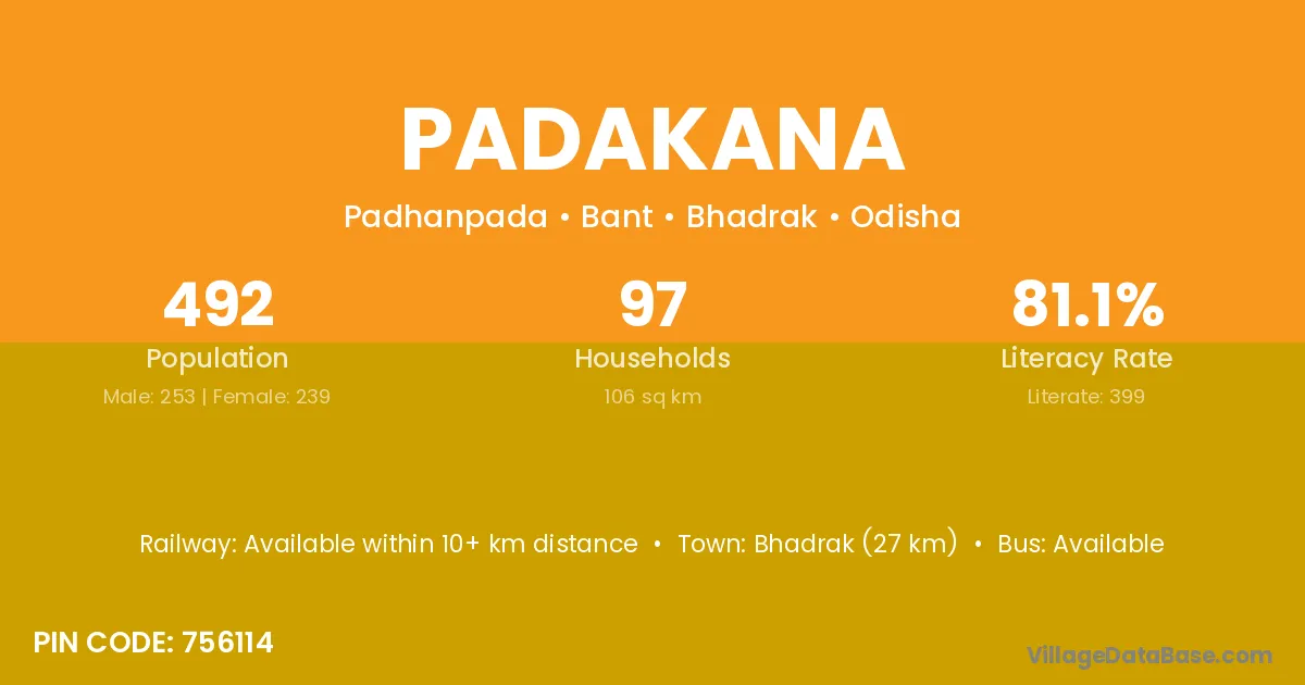 Bhadrak (27 km) is the nearest town to Padakana village for major economic activities and is located approximately 27 km away.
