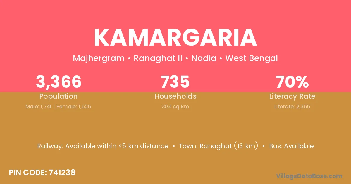 Basudebpur (6 km) is the nearest town to Kamargaria village for major economic activities and is located approximately 6 km away.