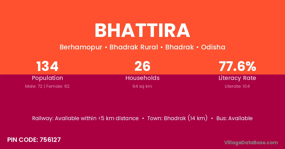 Bhadrak (14 km) is the nearest town to Bhattira village for major economic activities and is located approximately 14 km away.