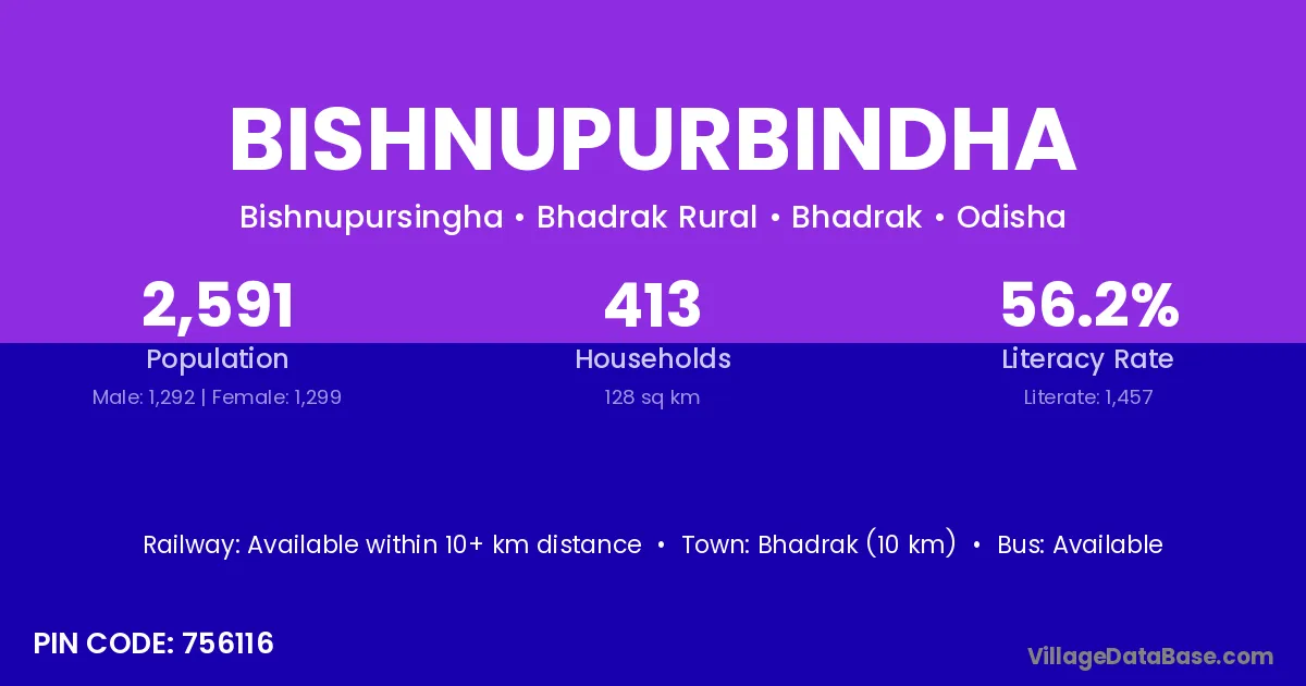 Bhadrak (10 km) is the nearest town to Bishnupurbindha village for major economic activities and is located approximately 10 km away.