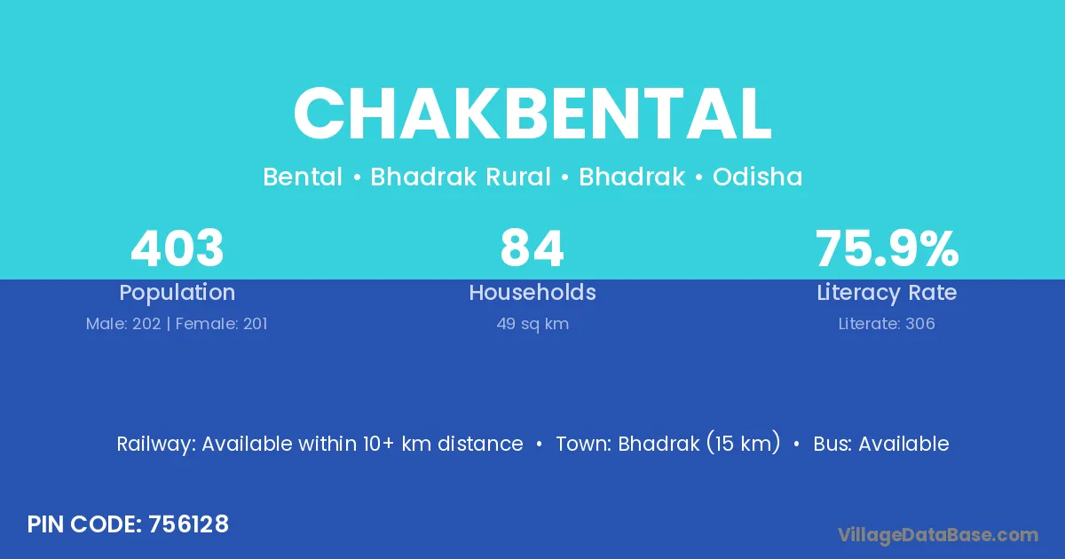 Bhadrak (15 km) is the nearest town to Chakbental village for major economic activities and is located approximately 15 km away.