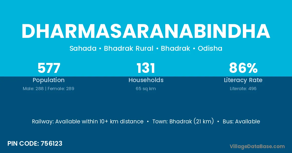Bhadrak (21 km) is the nearest town to Dharmasaranabindha village for major economic activities and is located approximately 21 km away.