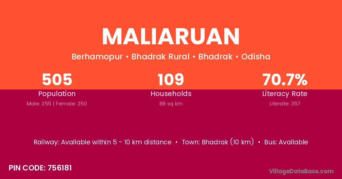 Bhadrak (10 km) is the nearest town to Maliaruan village for major economic activities and is located approximately 10 km away.