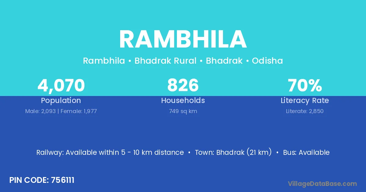 Bhadrak (21 km) is the nearest town to Rambhila village for major economic activities and is located approximately 21 km away.