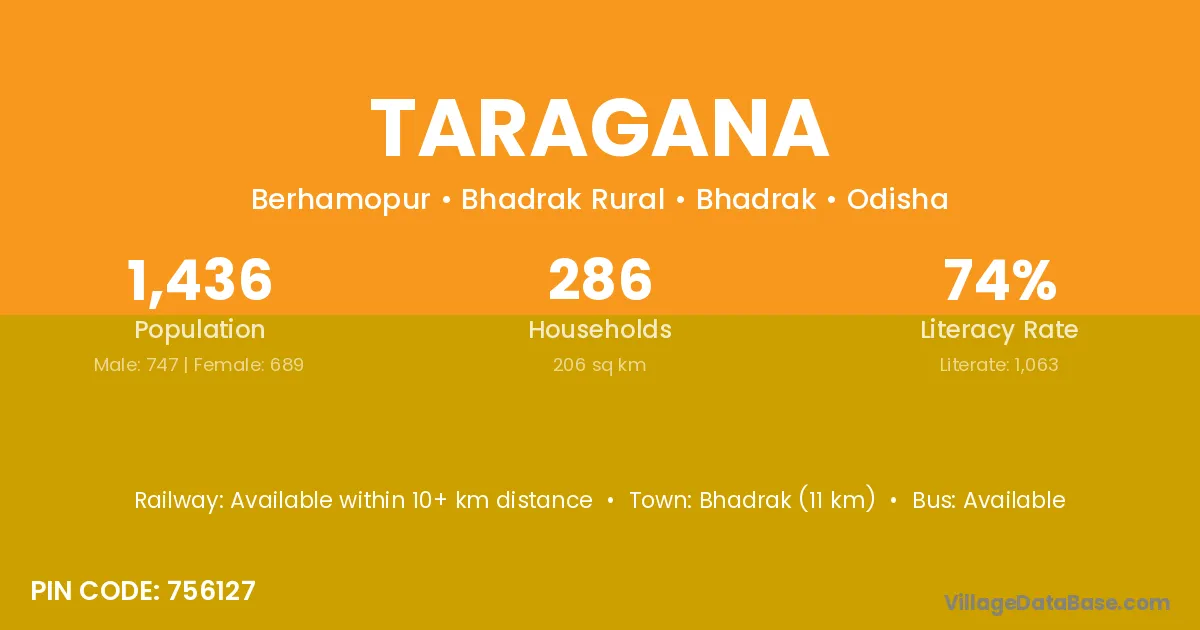 Bhadrak (11 km) is the nearest town to Taragana village for major economic activities and is located approximately 11 km away.