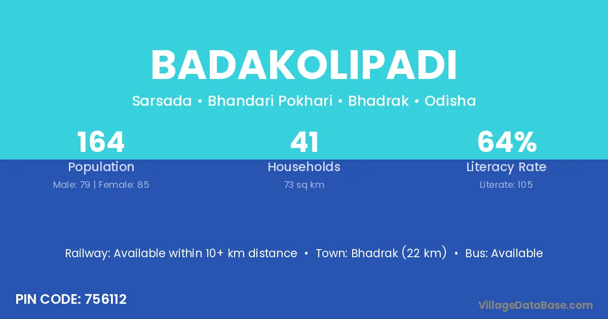 Bhadrak (22 km) is the nearest town to Badakolipadi village for major economic activities and is located approximately 22 km away.