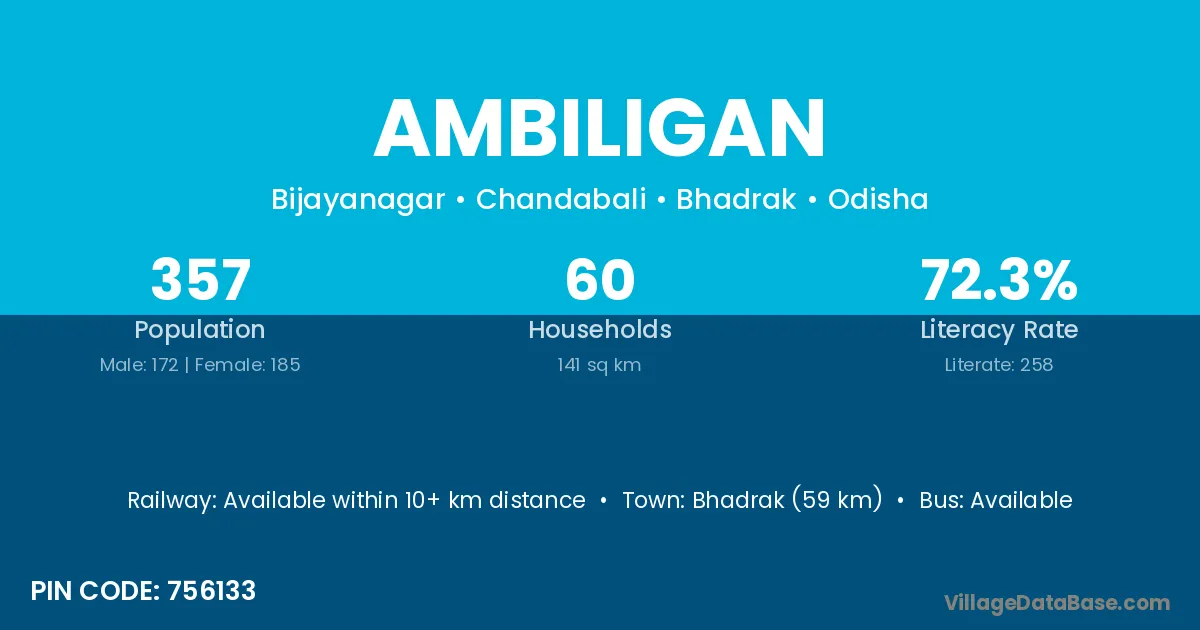 Bhadrak (59 km) is the nearest town to Ambiligan village for major economic activities and is located approximately 59 km away.